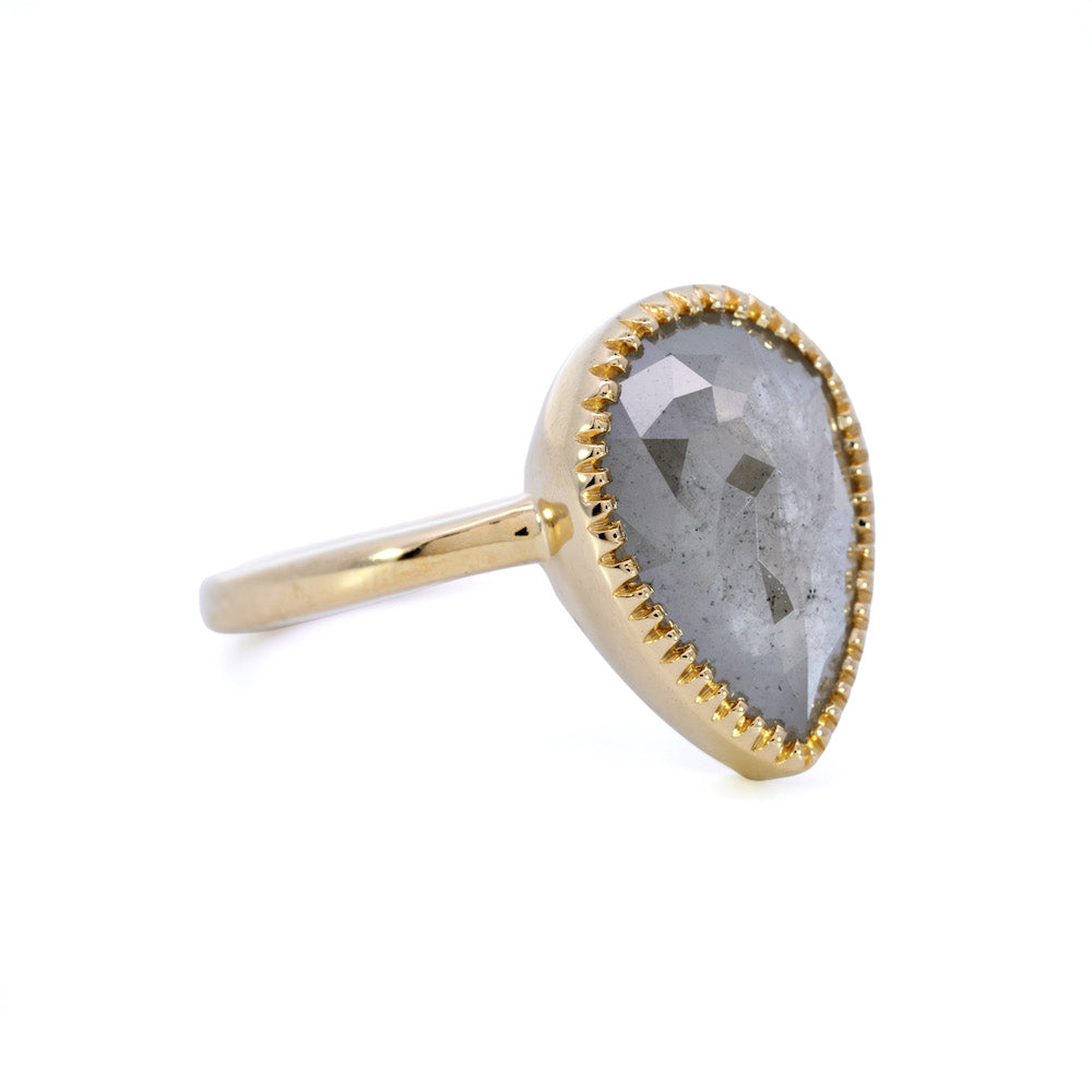 Introducing Anne — our newest solitaire and a beautiful addition to the Magpie lineup. This one has a chunkier milgrain in order to hang onto that juicy Pear Rose cut, 2.76ct Salt & Pepper Diamond, courtesy of Misfit Diamonds