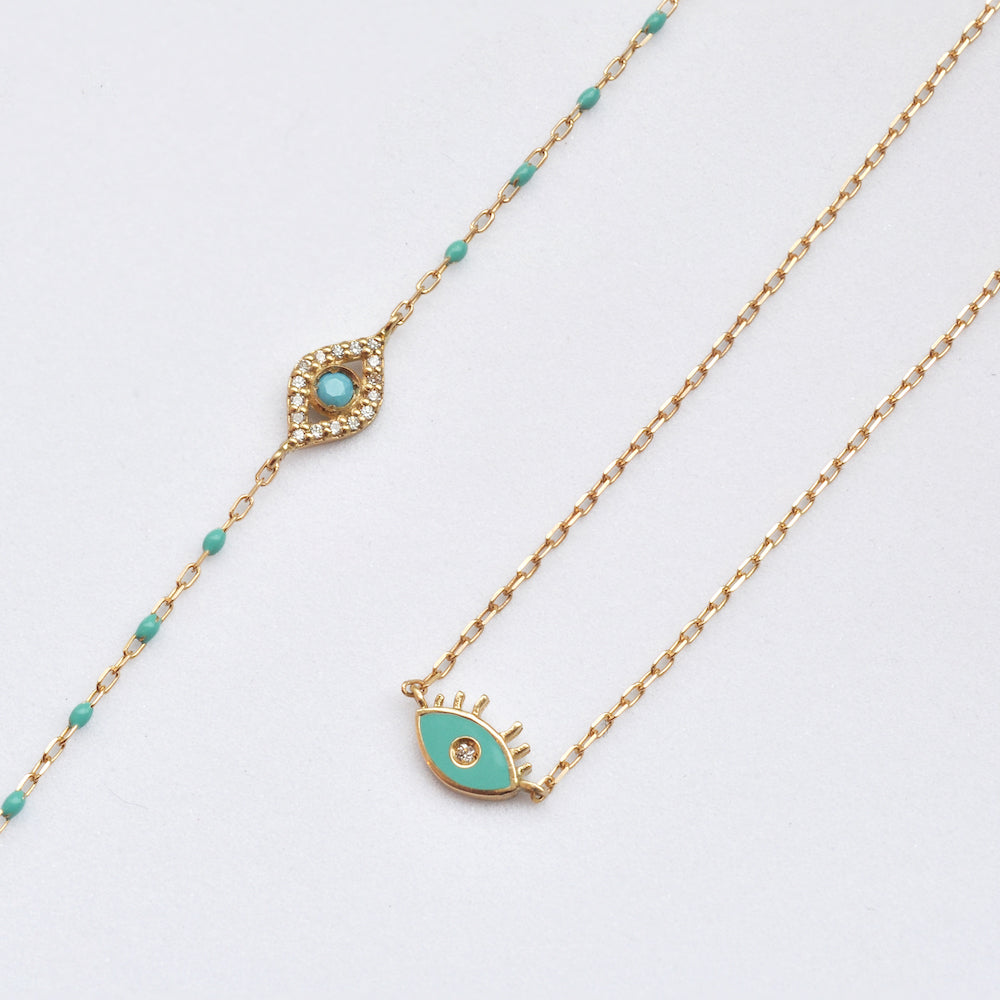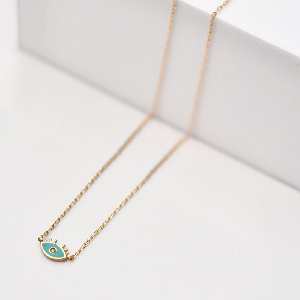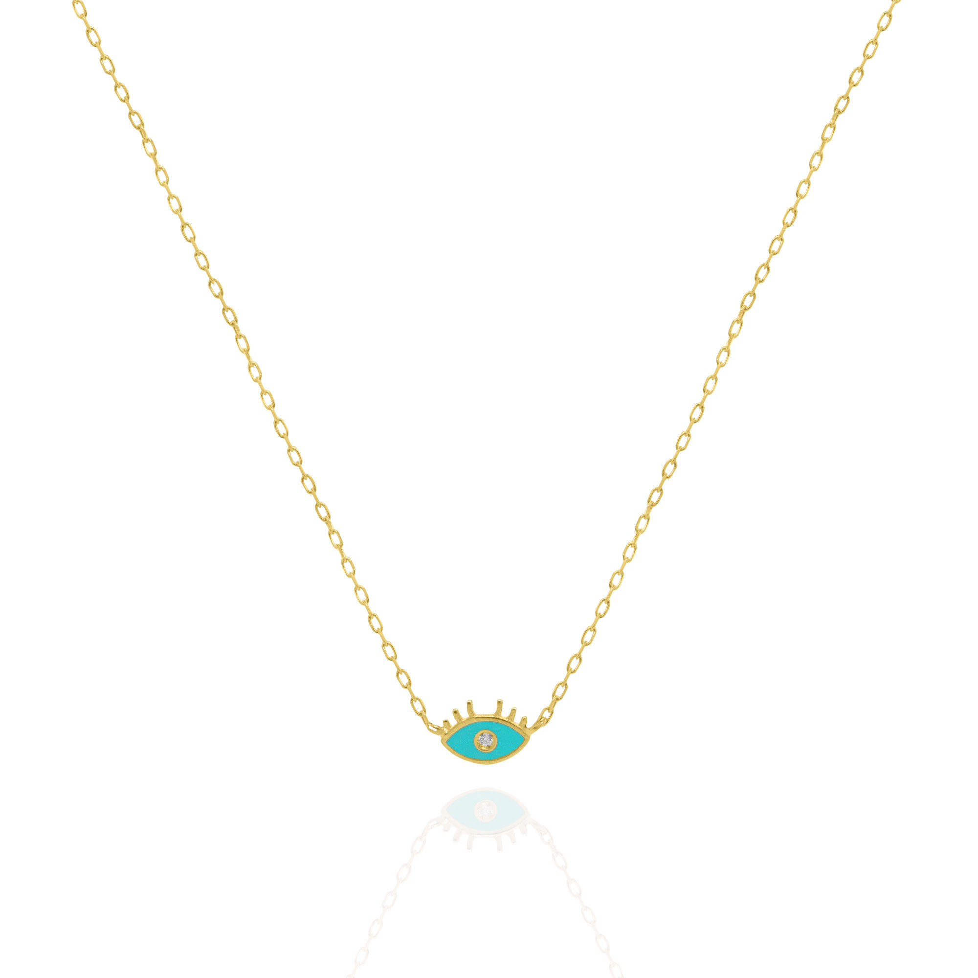 Yellow Gold Evil Eye with CZ & Turquoise Enamel Necklace
