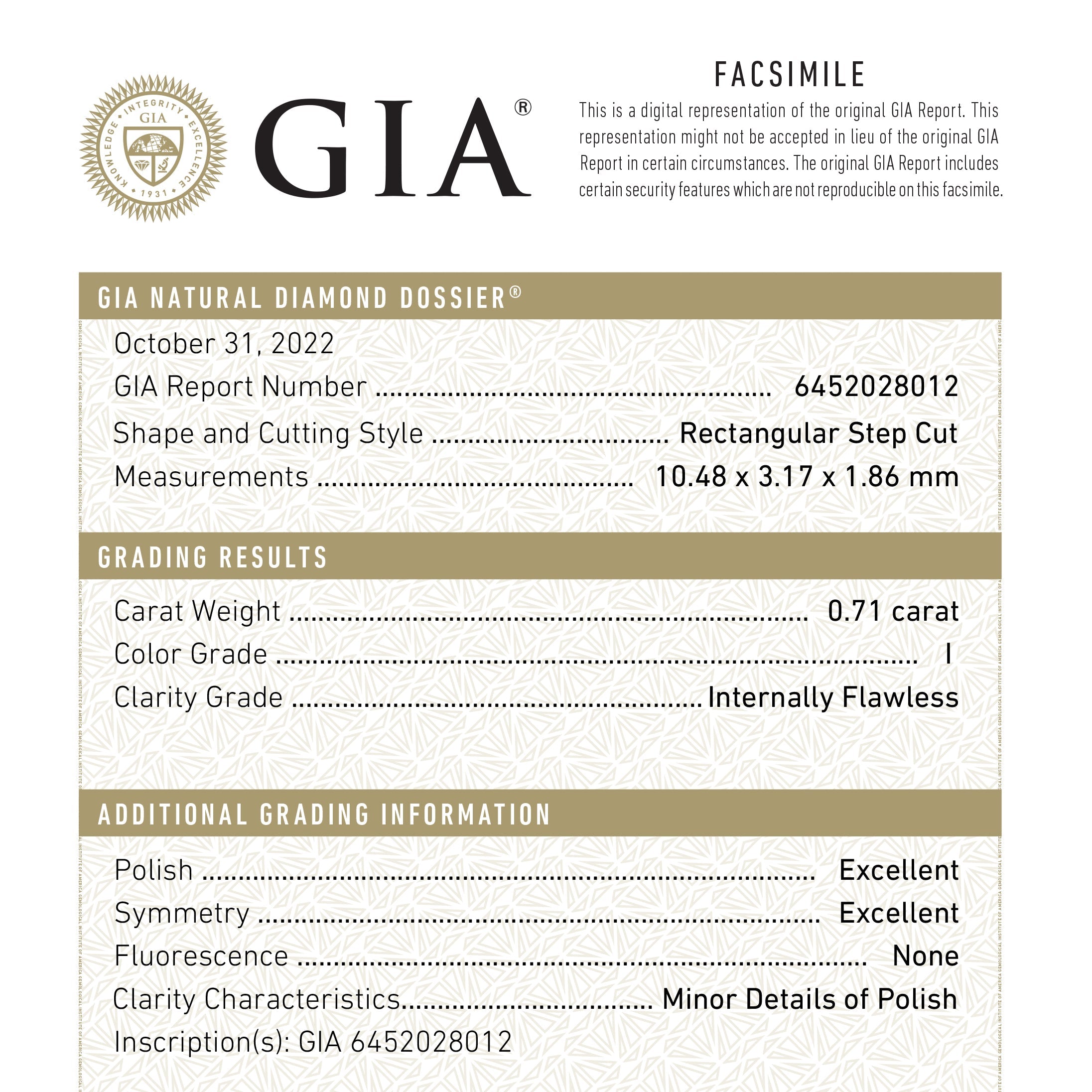 0.71ct 10.48x3.17x1.86mm GIA Internally Flawless I Baguette Step Cut 24302-01
