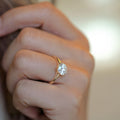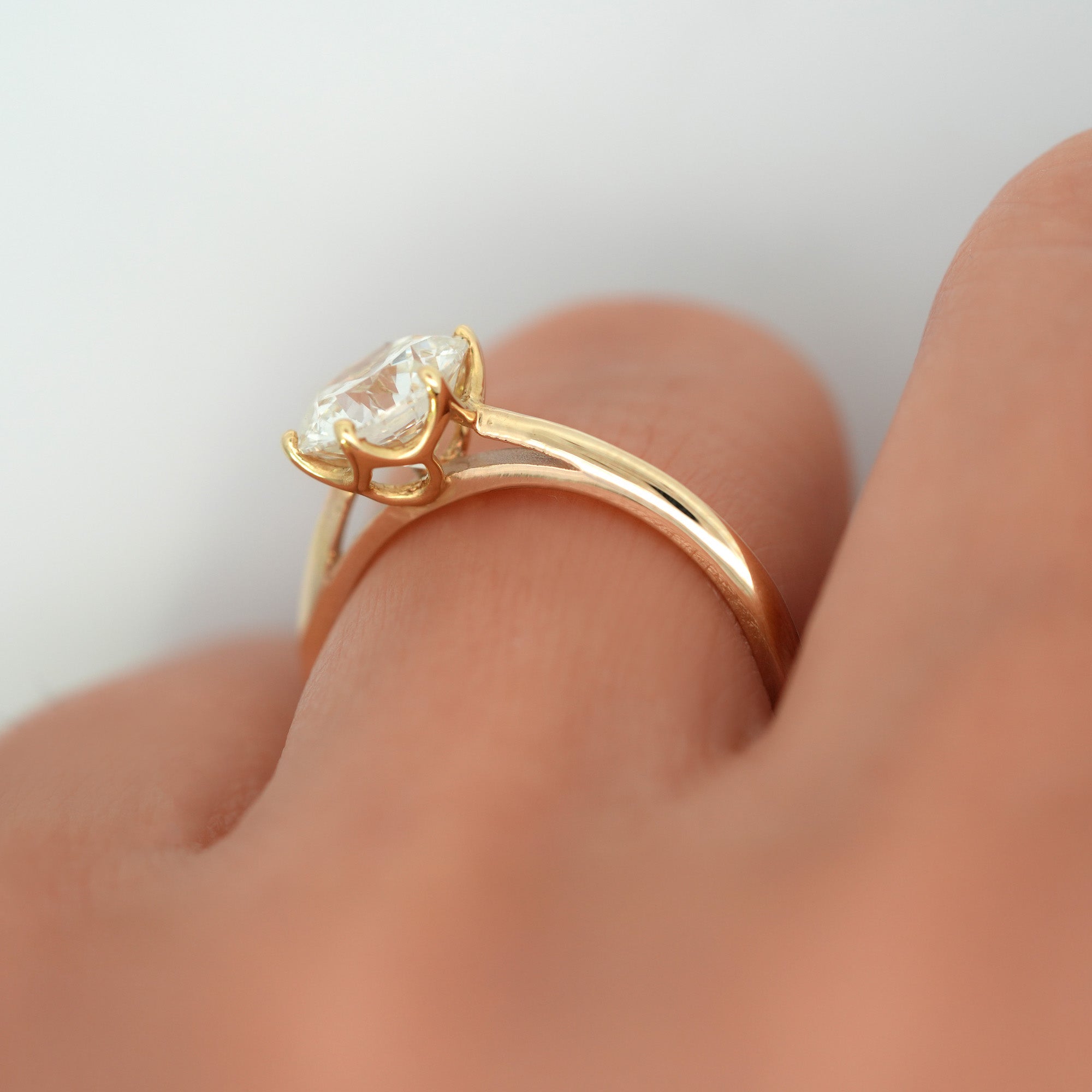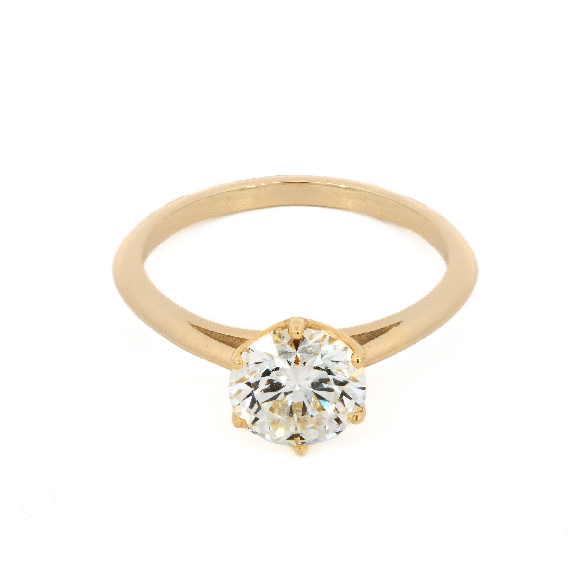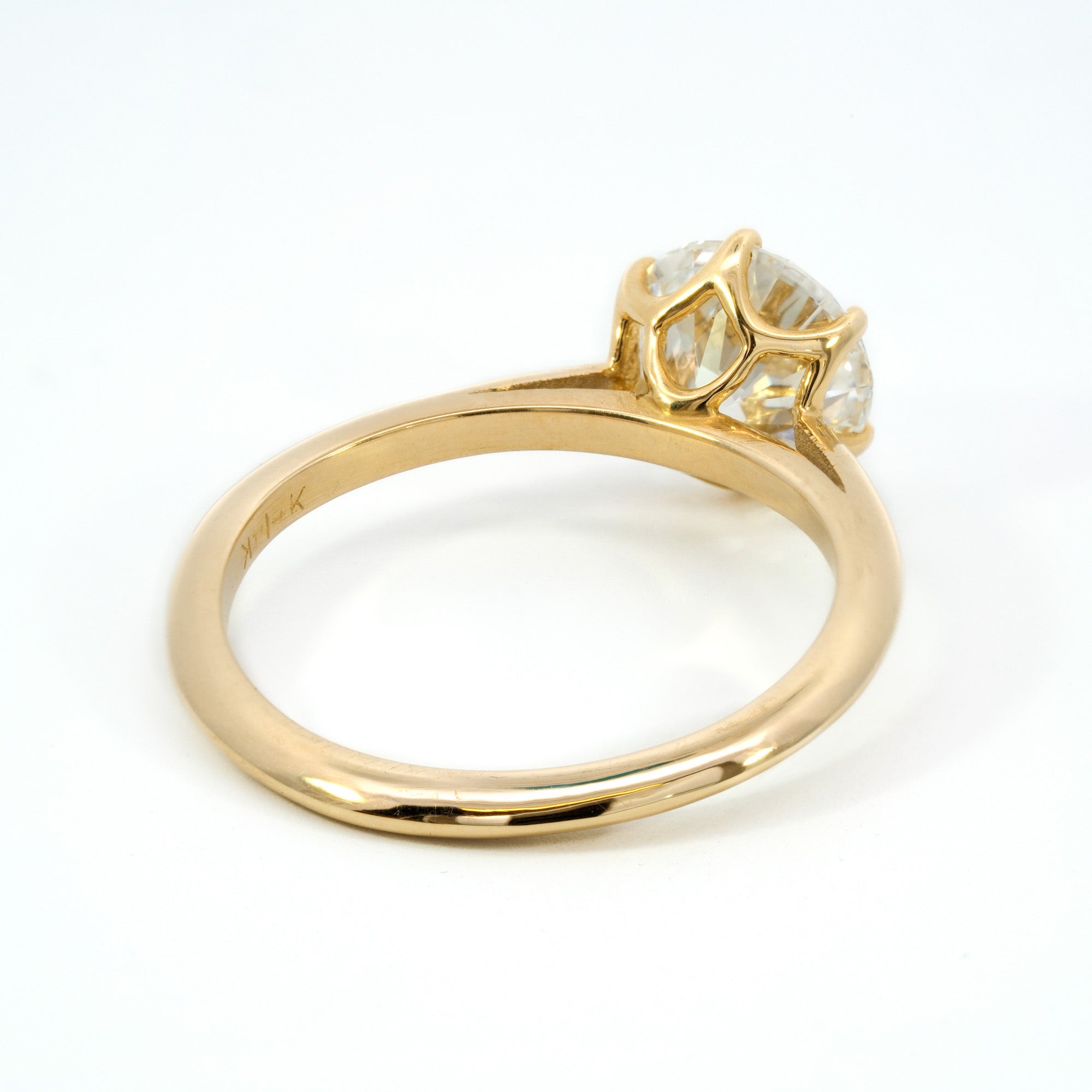 Awe-inspiring and handcrafted, this solitaire ring features a 1.87ct lab diamond set in a unique basket weave setting. Made with a polished finish 14k gold, with 6 prongs, this ring is perfect for the one-of-a-kind person in your life!  Currently a size 7, but can be re-sized per your specifications.