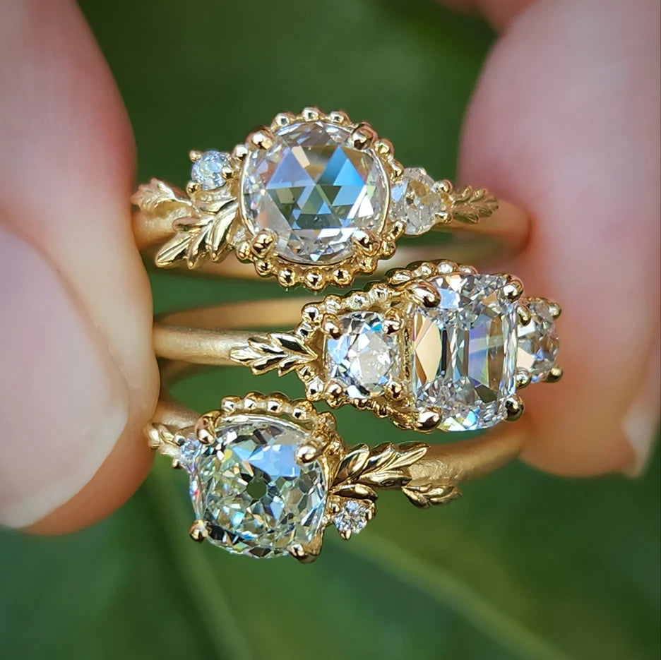 This rose cut diamond is magic. Delicate beading cradles a glowy rose cut beauty, framed by the glittering facets of diamond dewdrop sparkle. Lyrical, with sinuous leaves and a graceful presence, this golden treasure is a modern heirloom.