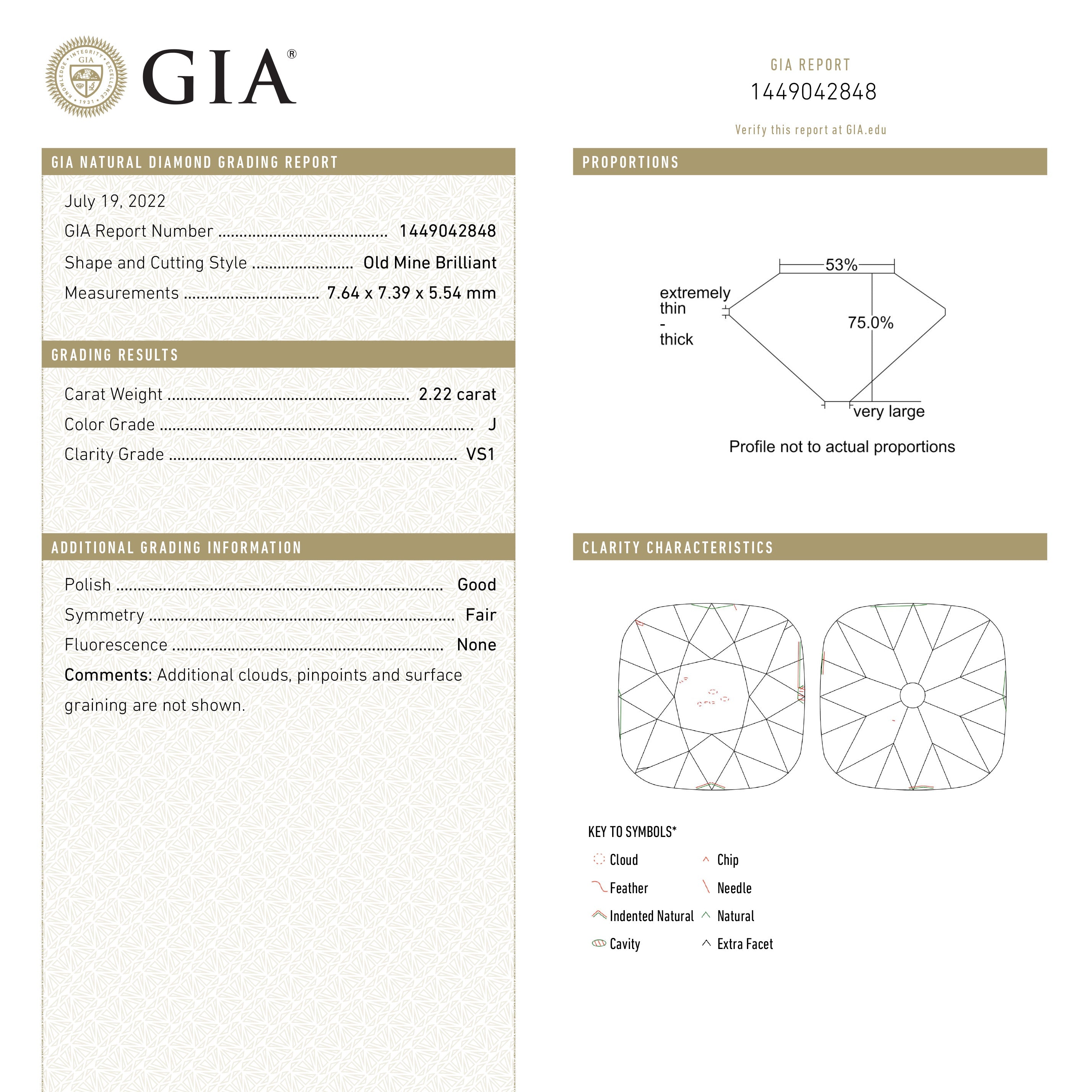 2.22ct 7.64x7.39x5.54mm GIA VS1 J Antique Old Mine Cut 23115-01