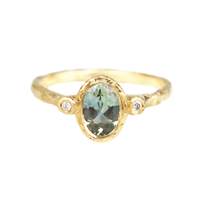 A striking take on classic proportions, this rich green sapphire ring is all about understated impact. The softly domed oval is framed by two bright natural diamonds and set low in warm 14k yellow gold, giving it a grounded, easy elegance. Beautiful worn alone or layered into a stack, it brings a subtle sense of colour and presence to the hand.
