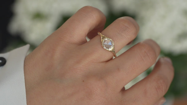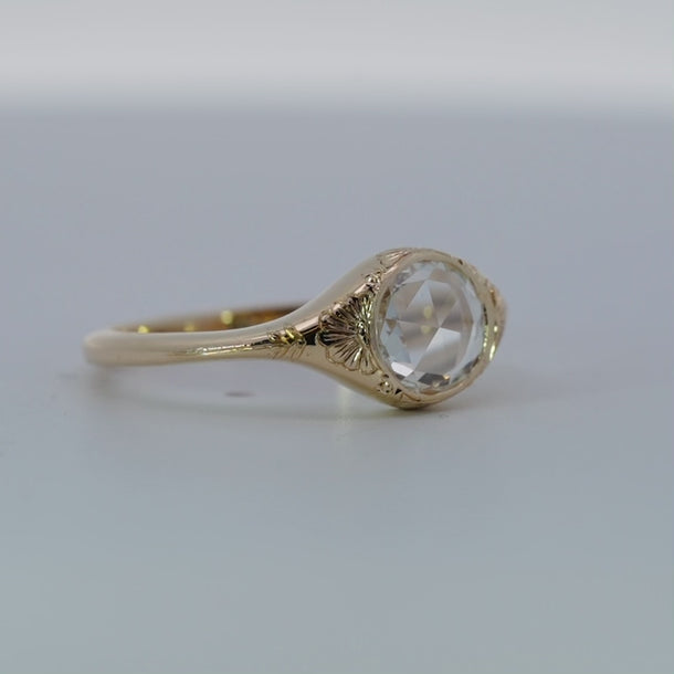 Adelaide brings together a soft antique feel with a clean, modern edge. A 6mm rose cut stone is set in a smooth 14k gold bezel, surrounded by a hand-engraved floral pattern that adds detail without overwhelming the piece. It’s an easy balance of old and new.