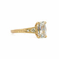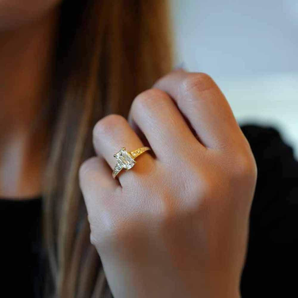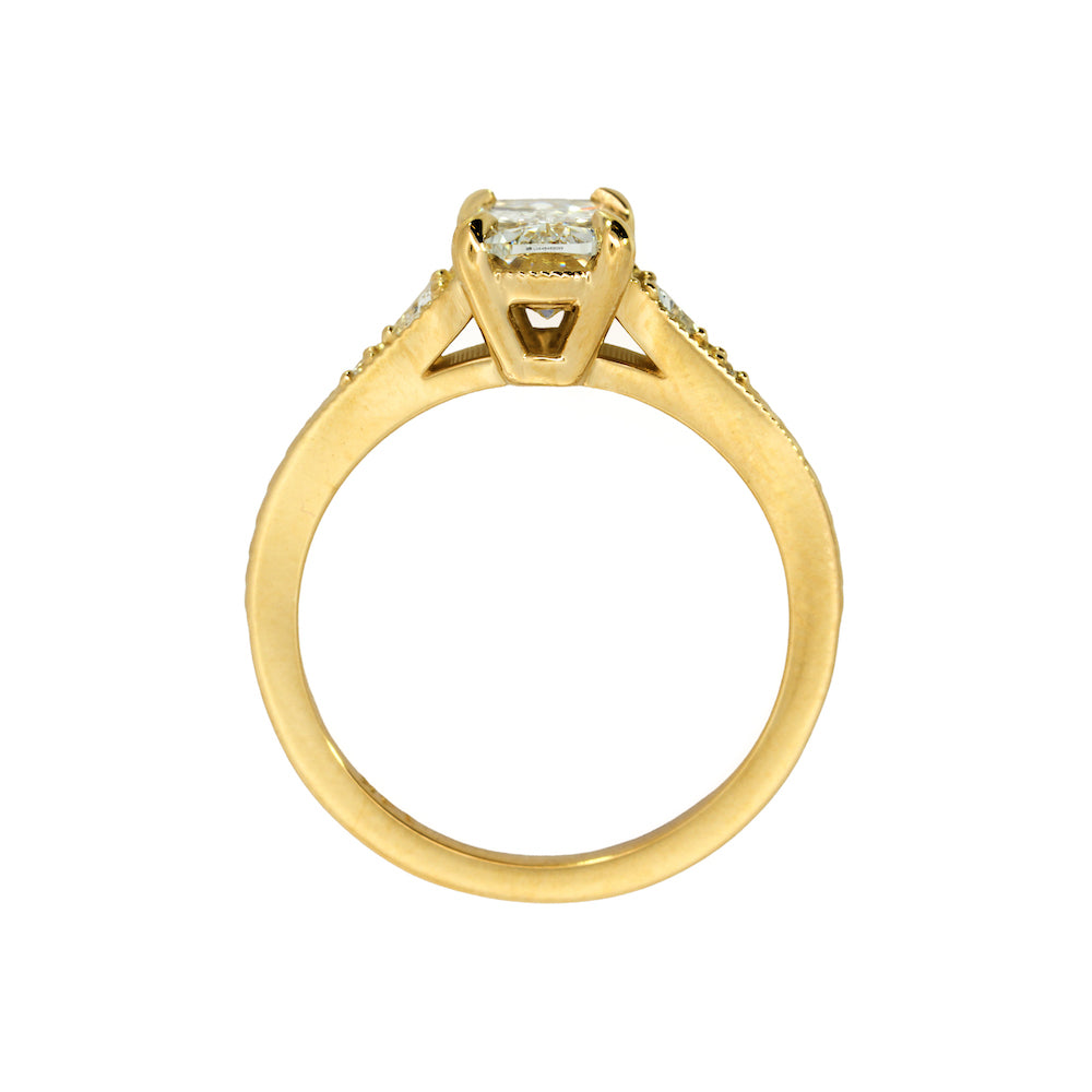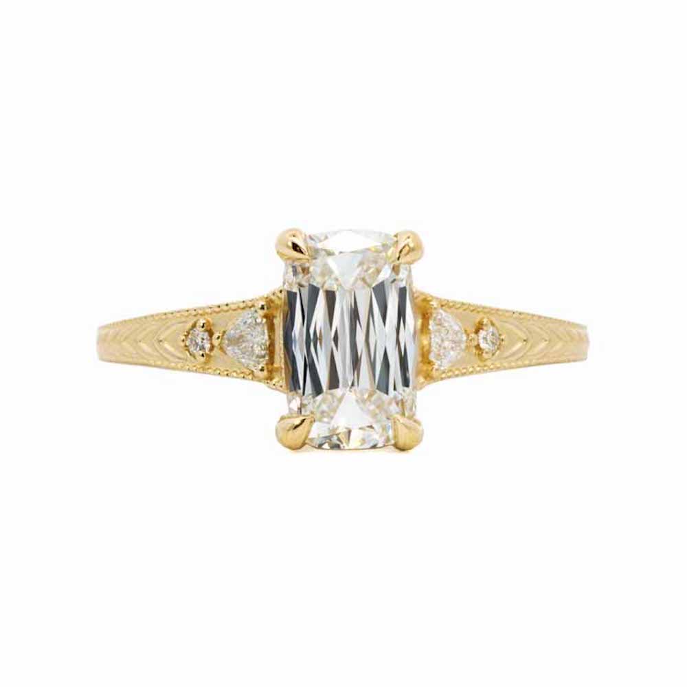Introducing the Taylor ring, our newest Magpie design. This style features a diamond-accented, milgrained band with a wide, tapered shank that feels both substantial and refined. This particular Taylor showcases an uncommon emerald-cut diamond known as a scissor cut or criss cut — a striking variation on the traditional emerald shape.